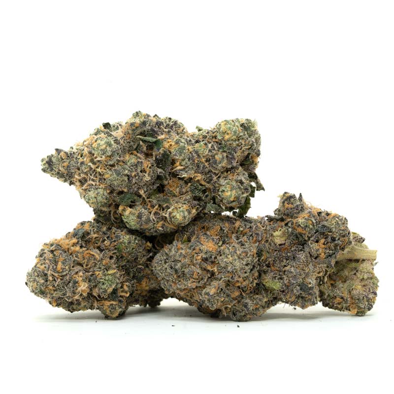 - Appearance: Medium sized buds with deep green and purple leaves sparse brown hairs and a frosty coat of trichomes