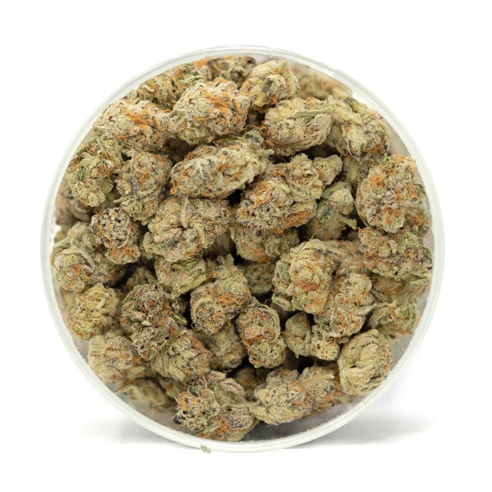 - Appearance: Medium-sized buds, bright green leaves with dark purple hues, long amber orange hairs and covered in a thick layer of THC crystals
