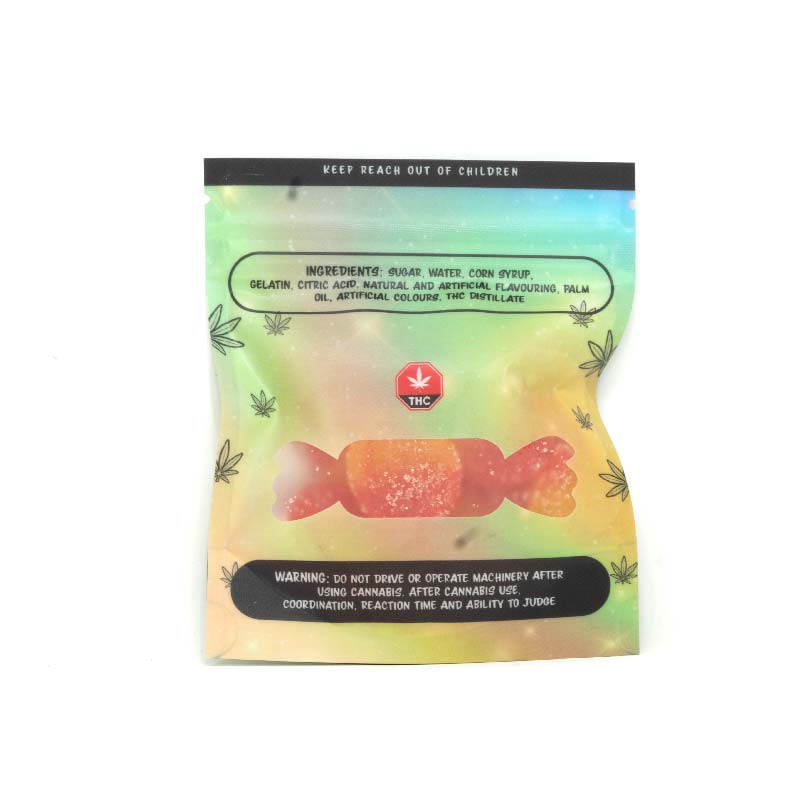 - Ingredients: Sugar, Water, Corn Syrup, Gelatin, Citric Acid, Natural and Artificial Flavouring, Palm Oil, Colours, THC Distillate.